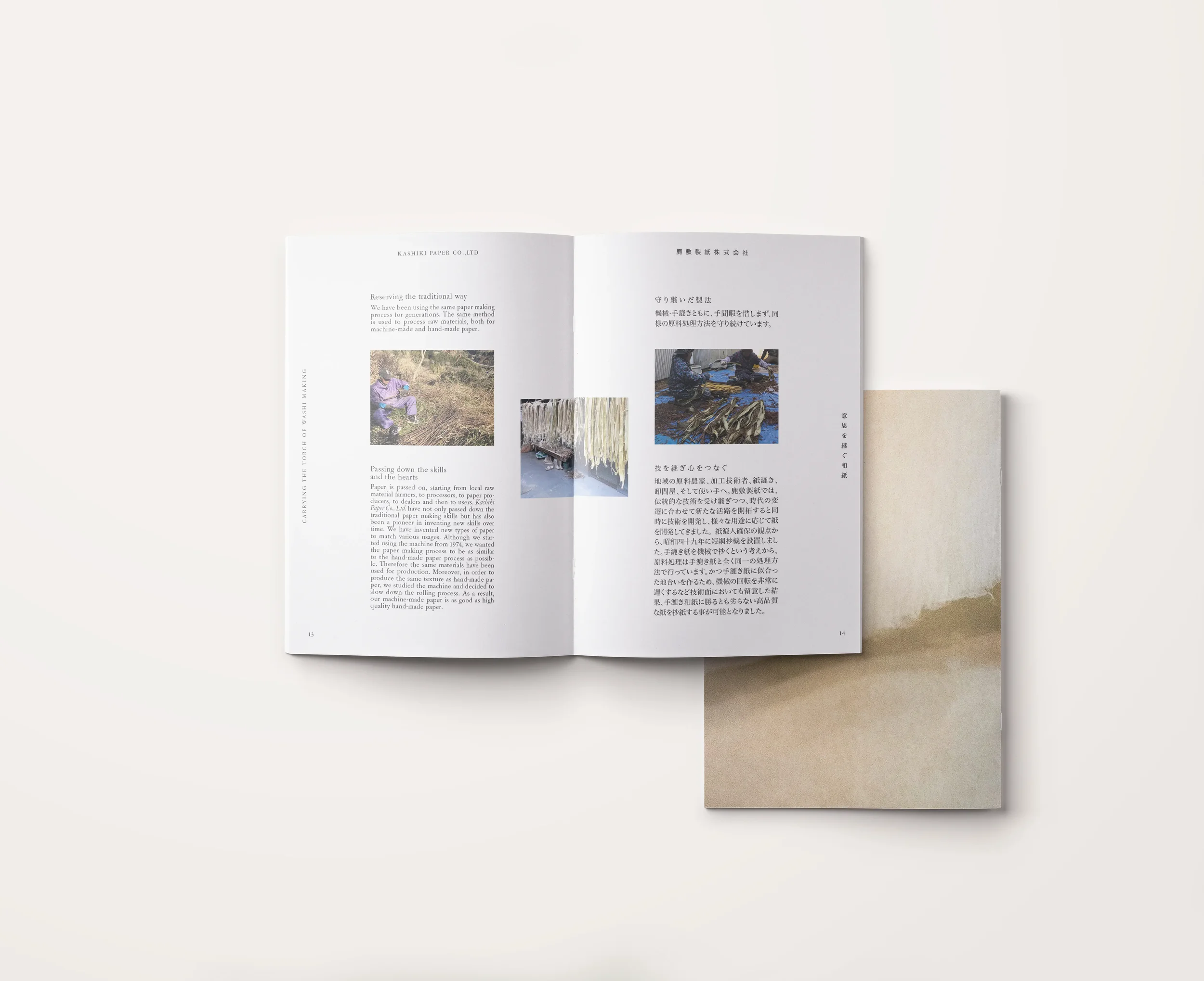 This bilingual booklet explores the tradition of Japanese washi through textured, handcrafted pages. Focusing on Tosa washi from Kochi Prefecture, it highlights the paper’s strength, durability, and natural beauty. Made from local plant fibers through a meticulous process, the thin yet resilient sheets embody Japan’s appreciation for natural materials and the elegance of imperfection.